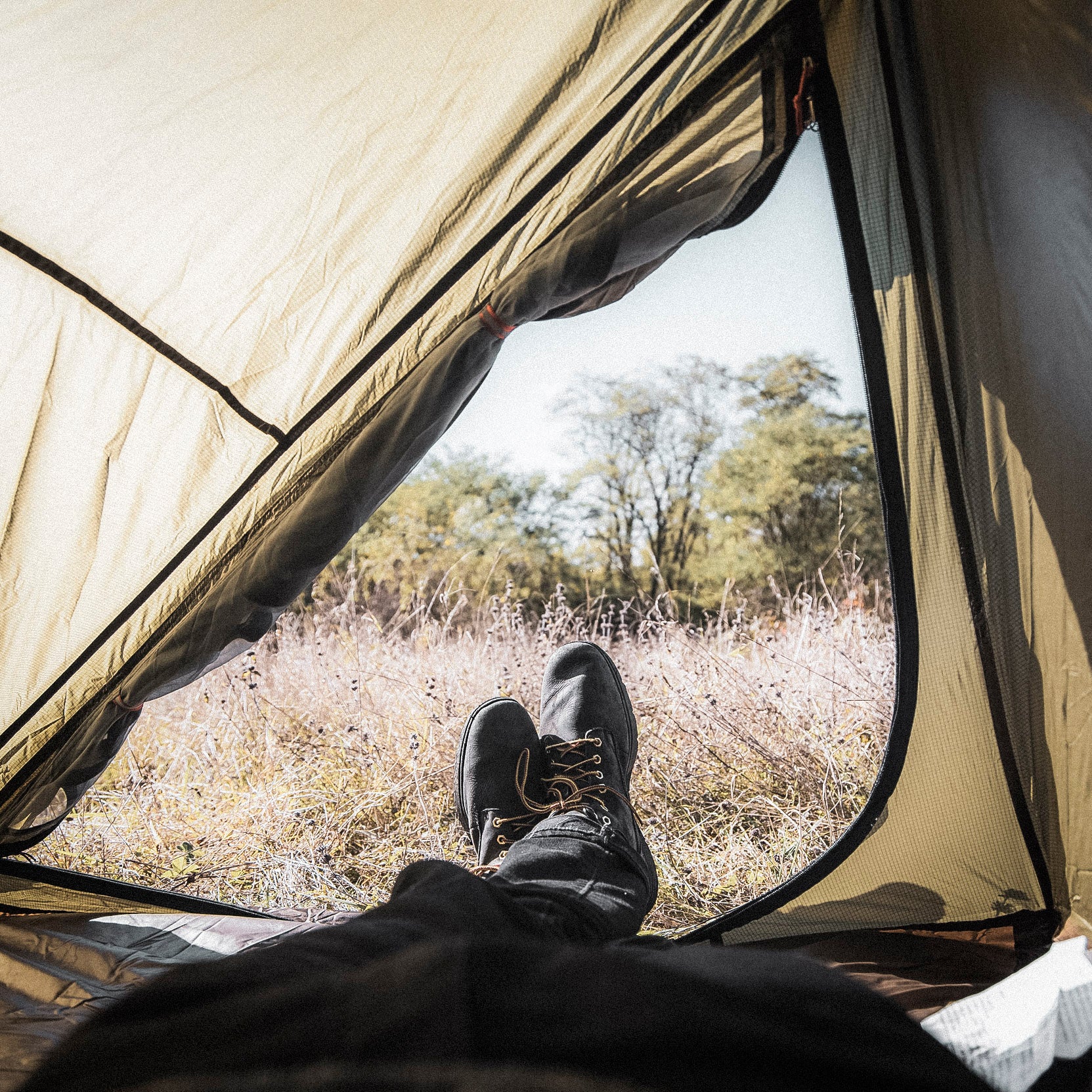 New for the 4th release, we addressed the biggest issue folks have when using a single wall tent - condensation build-up. We have now created a vestibule on one side of the tent, protecting you from the elements, but allowing airflow to come in and flush out the humid air inside your tent through the long vent found at the crown of the tent. This creates a stove pipe effect, bringing cooler air down low and hot air out the top. It also gives you a great place to store your boots without tracking any dirt inside your tent.